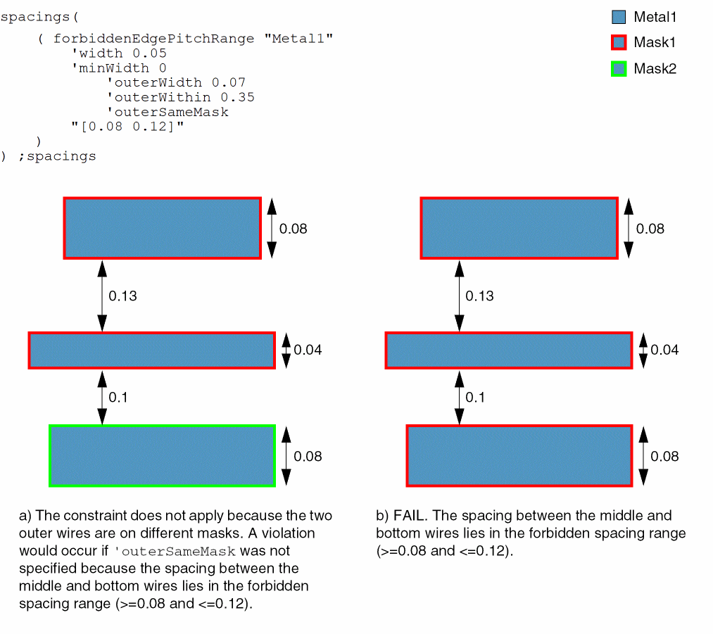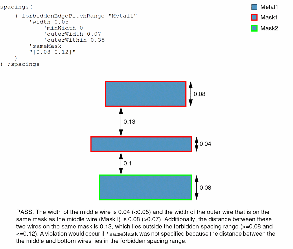 - Example 8: forbiddenEdgePitchRange with width, minWidth, outerWidth, outerWithin, outerSameMask