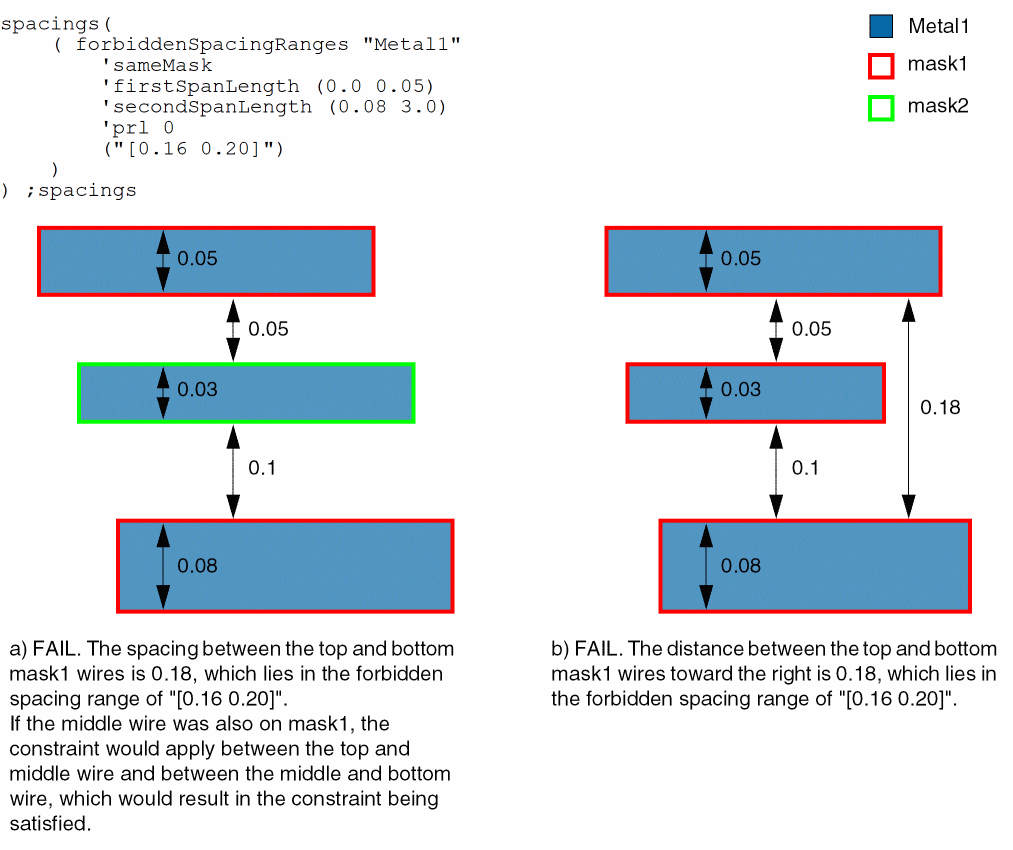spacings( (forbiddenSpacingRanges "Metal1" 'sameMask 'horizontal 'firstSpanLength (0.0 0.05)