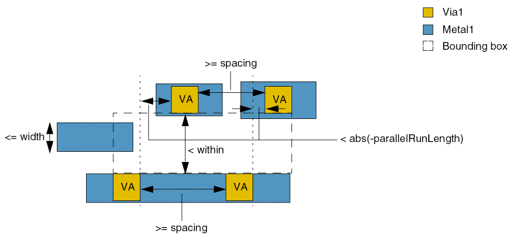 - Each via cut has a neighboring via cut at a distance less than within from it and has parallel run length greater than parallelRunLength with this neighboring via cut.
