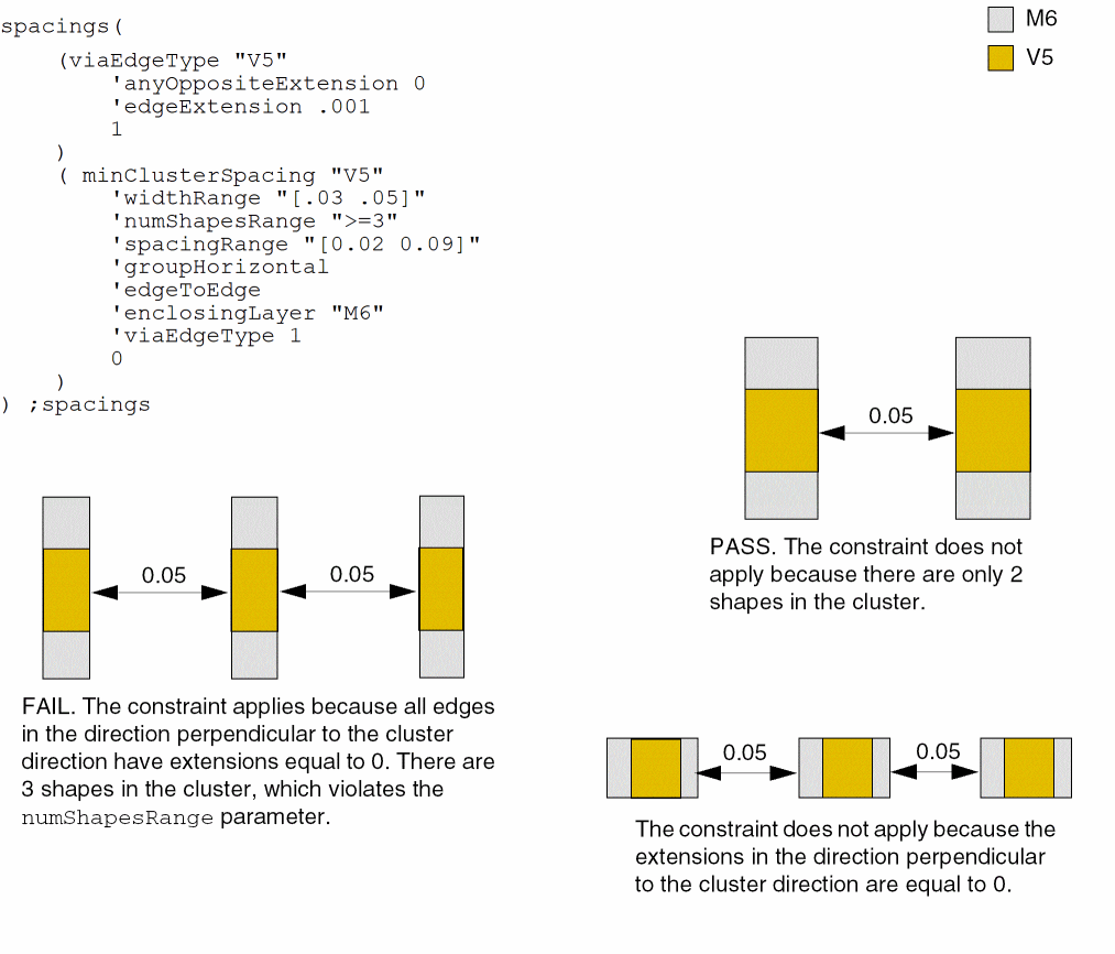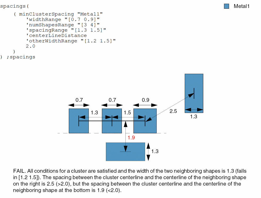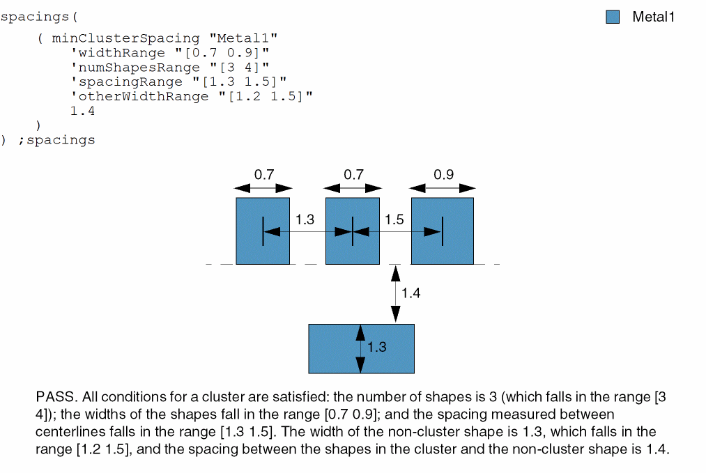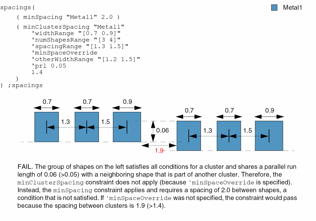 - Example 5: minClusterSpacing with widthRange, numShapesRange, spacingRange, minSpaceOverride, otherWidthRange, and prl