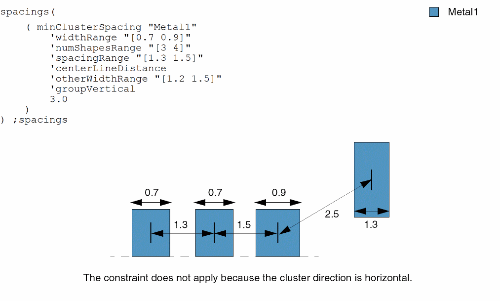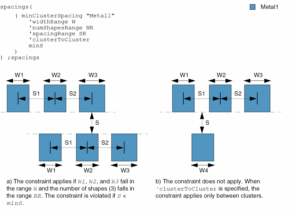 (Virtuoso Advanced Node for Layout Standard) Specifies the minimum spacing between two neighboring clusters or a cluster and other neighboring shapes that may or may not be part of another cluster, on the same layer. The shapes in a cluster must be exactly aligned and must satisfy all of the following conditions:
