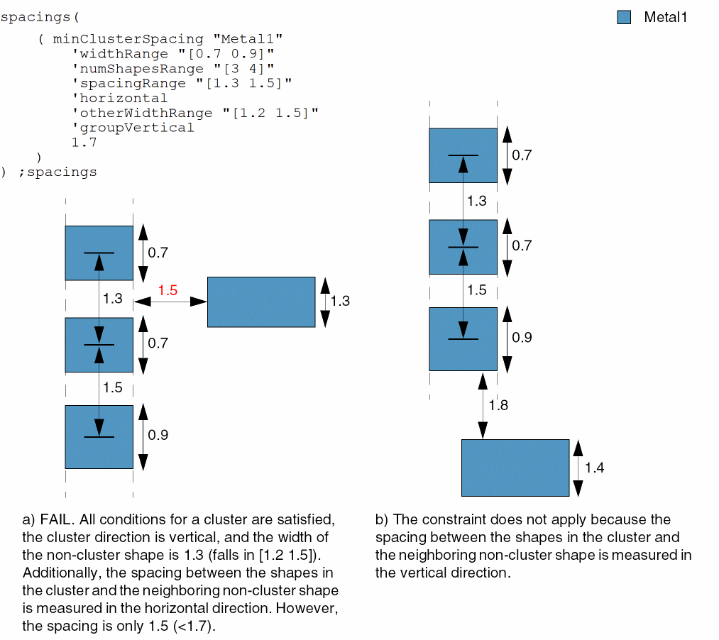 - Example 3: minClusterSpacing with widthRange, numShapesRange, spacingRange, centerLineDistance, otherWidthRange, and groupVertical