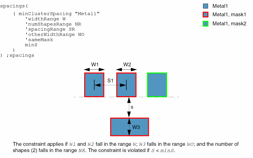 spacings( ( minClusterSpacingtx_layer'widthRangeg_widthRange'numShapesRangeg_numShapesRange'spacingRangeg_spacingRange['centerLineDistance] ['minSpaceOverride] ['horizontal | 'vertical] ['otherWidthRangeg_otherWidthRange] ['groupHorizontal | 'groupVertical ['enclosingLayertx_enclosingLayer['viaEdgeTypex_edgeType] ] ] ['prlf_prl] ['clusterToCluster] ['edgeToEdge] ['sameMask] ['widthHorizontal | 'widthVertical]f_spacing)
