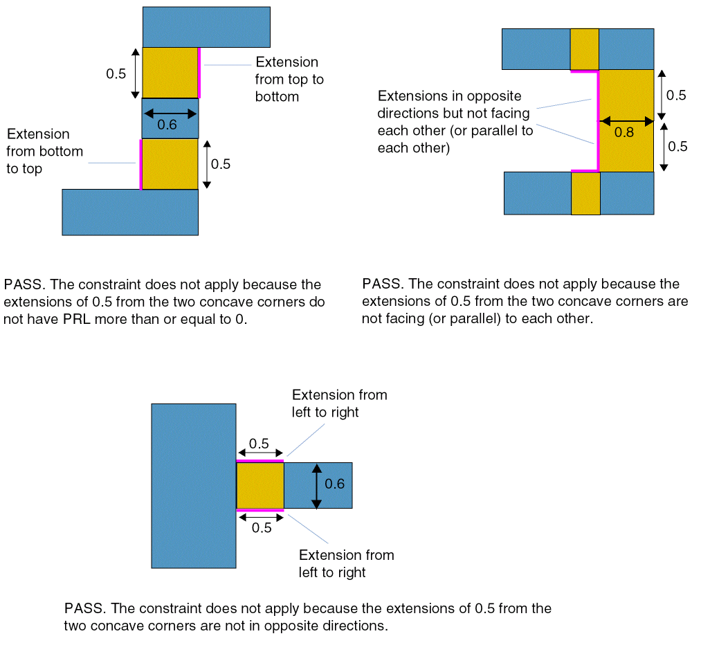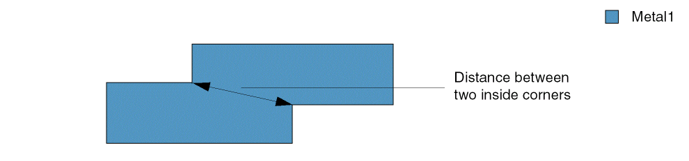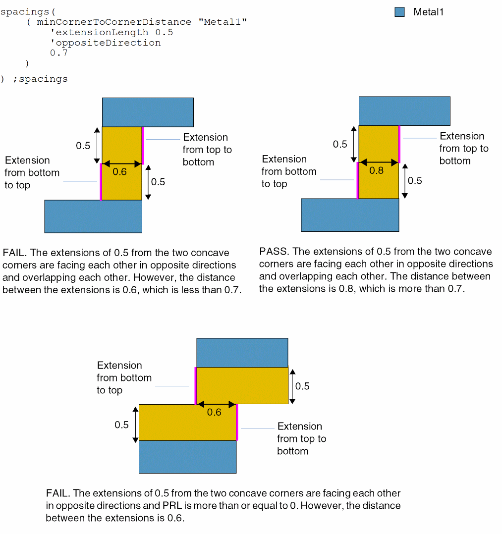 (Virtuoso Layout Suite EXL and higher tiers) Specifies the length of the extension that needs to be created from the internal concave corners. Distance checking would take place between the parallel extensions of the two corners where the extensions have parallel run length more than or equal to zero.