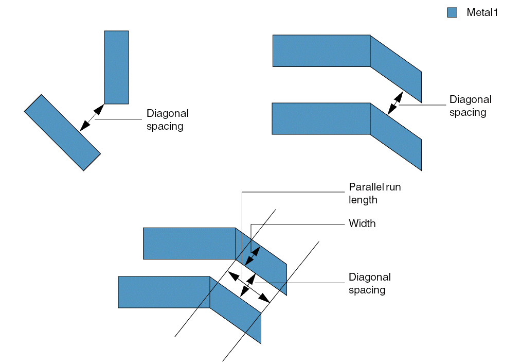 Specifies the minimum diagonal spacing between two shapes on a layer. The distance must be calculated as the Euclidean diagonal distance, and not as the Manhattan distance.