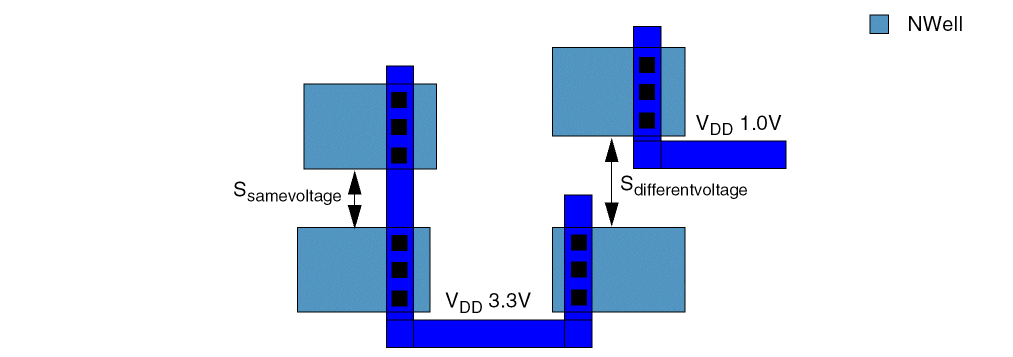 This constraint applies to wells, transistors, and devices. When two geometries, typically two "NWell" shapes, are at different voltages, a larger spacing is required between the two shapes. The larger spacing prevents potential leakage problems through the substrate.
