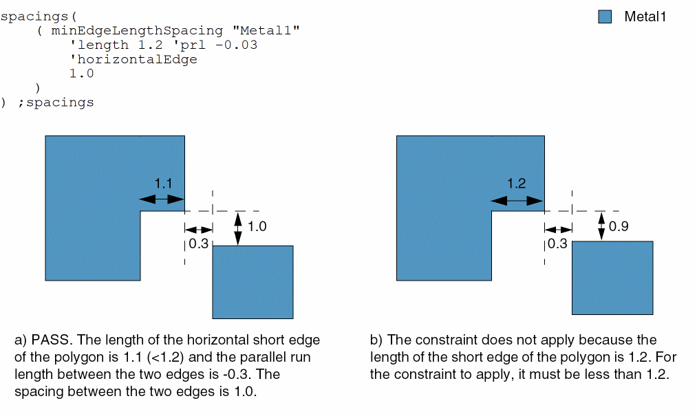 spacings( ( minEdgeLengthSpacingtx_layer'lengthf_length['prlf_parallelRunLength] ['horizontalEdge | 'verticalEdge]f_spacing)