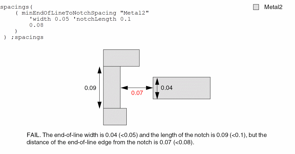 The distance between an end-of-line edge that is less than 0.05 wide and a notch that is less than 0.1 in length must be at least 0.08.