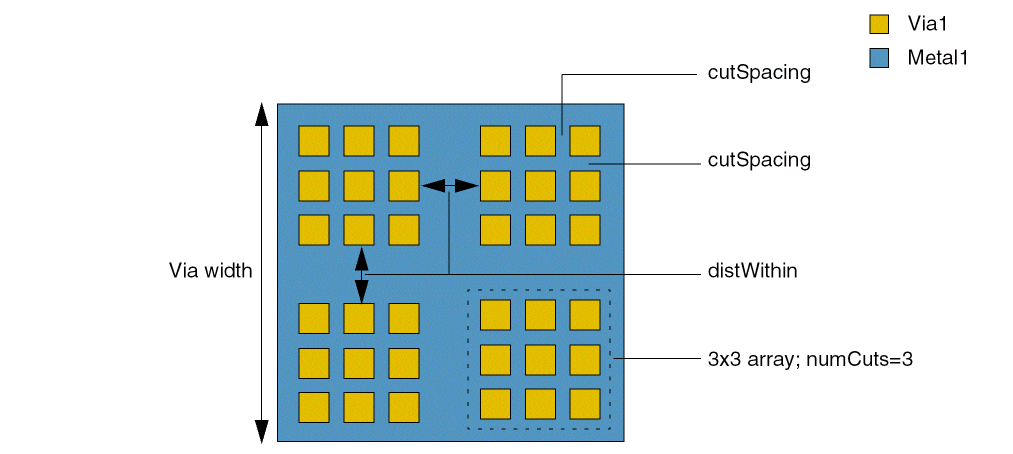The constraint applies to via cuts in a neighboring array if it is at a distance less than distWithin from the large array and has parallel run length greater than or equal to arrayWidth, which is measured in the direction perpendicular to distWithin (the via cuts in such a neighboring array are considered part of the large array). |