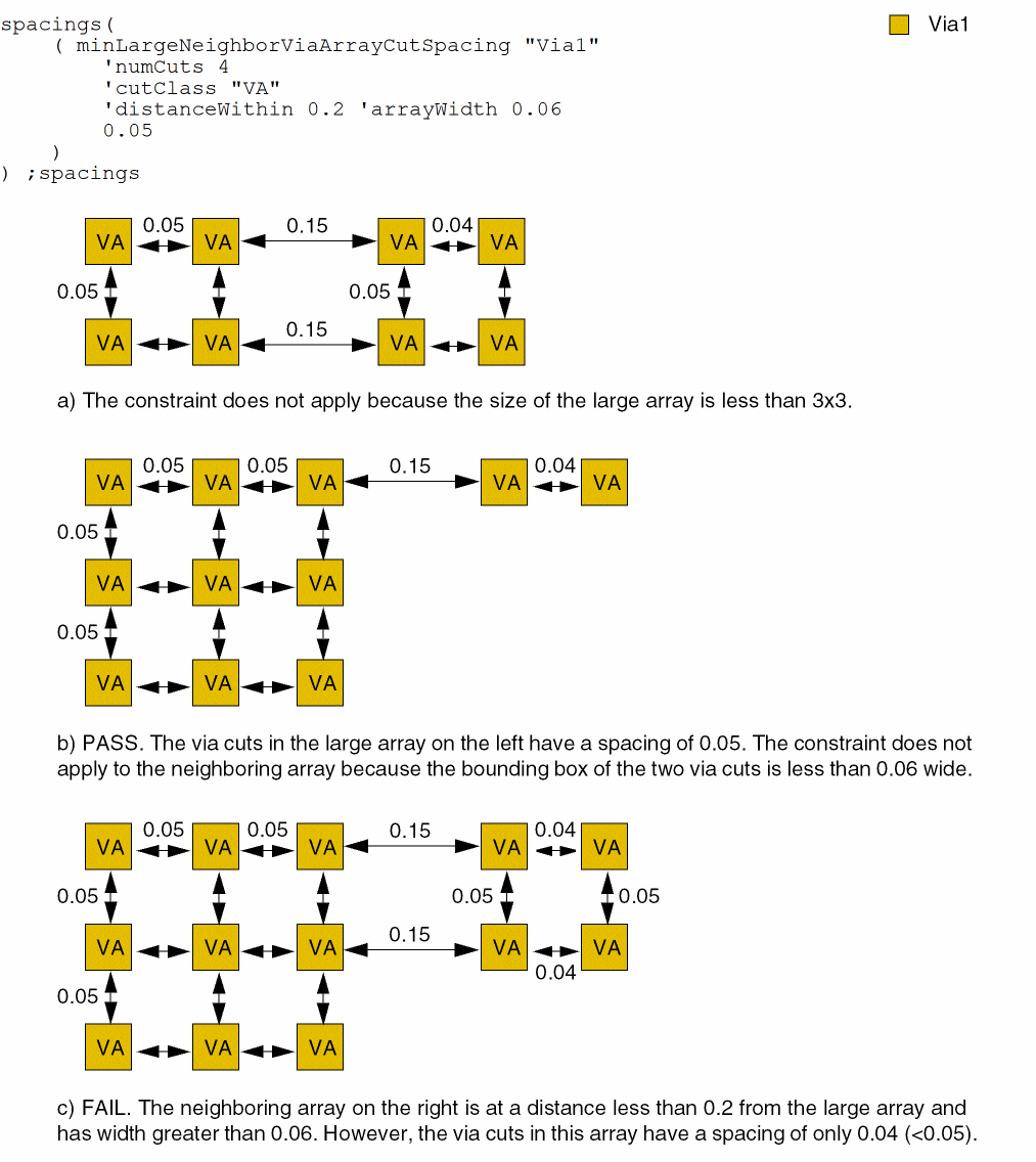 The spacing between VA via cuts in a 3x3 array and in a neighboring array at a distance less than 0.2 from the large array with width greater than or equal to 0.06 must be at least 0.05.