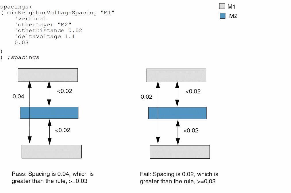 In this example, the maximum delta voltage is assumed to be > 1.1. A minimum vertical spacing of 0.03 is required between shapes on layer M1 if there is an M2 shape within 0.02 of the M1 shape on the same side as the M1 shape.