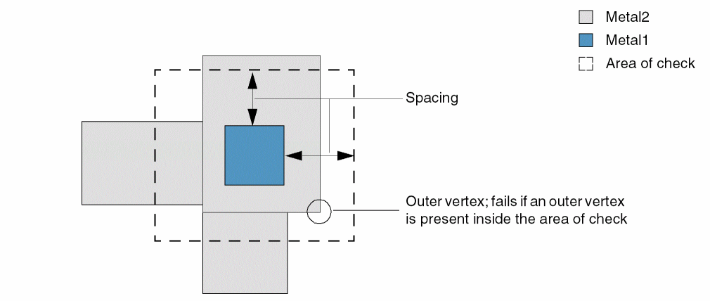 Specifies the minimum spacing between a shape on layer1 and an outer vertex of the enclosing shape on layer2. An outer vertex is defined as a convex corner.