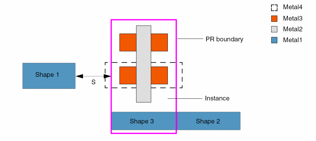 In the figure below, the minimum spacing between Shape 1 and the PR boundary of the instance is S. Shape 2 coincides with the PR boundary and would not cause a violation if 'coincidentAllowed is specified. The PR boundary need not be the same as the bounding box of the instance, as is the case below, where Metal4 in the master of the instance projects beyond the PR boundary.
