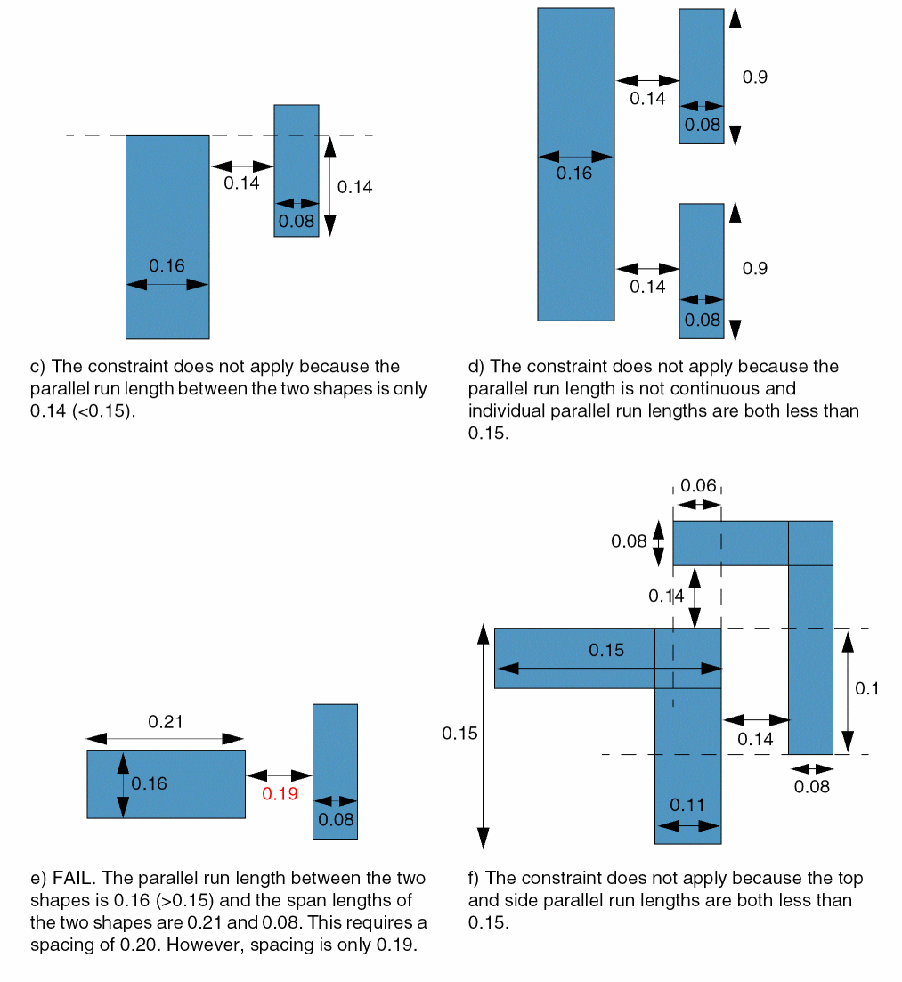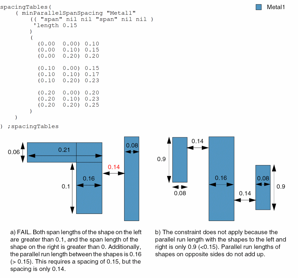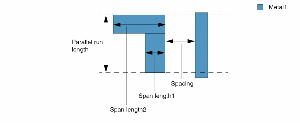 Specifies the minimum spacing between two shapes on the same layer based on their span lengths. The span length, which is defined as the length of the shape perpendicular to the edge corresponding to the parallel run length, can be different for different subsections of the shape. The parallel run length is measured as the continuous summed parallel run length between shapes. The constraint applies only if the parallel run length between the two shapes is greater than the specified value.