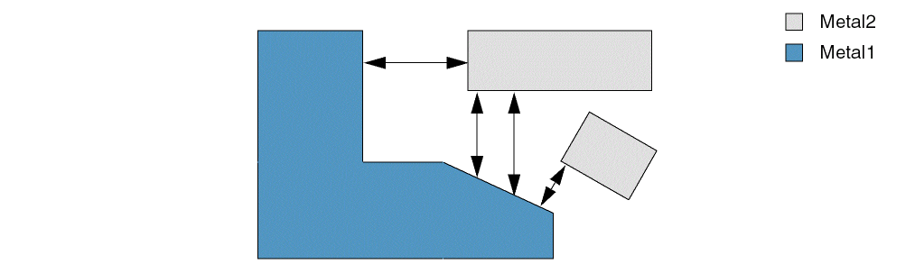 The maximum spacing between a Metal1 shape and a Metal2 shape must be 4.6.