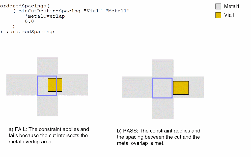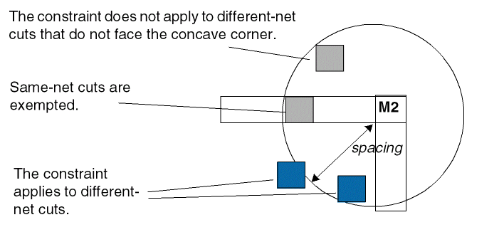 (Virtuoso Layout Suite EXL and higher tiers) The constraint applies only between a cut and a different-metal concave corner. ![]() |