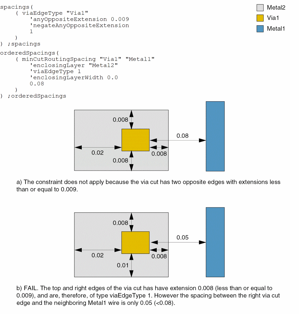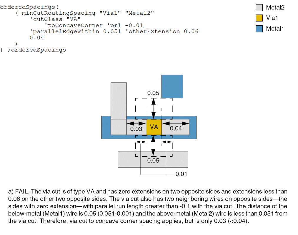 - Example 2: minCutRoutingSpacing with cutClass, toConcaveCorner, prl, parallelEdgeWithin, and otherExtension