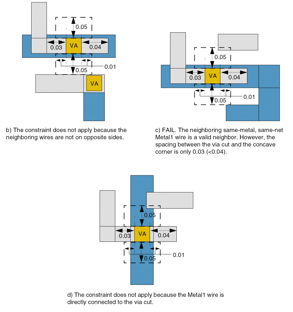 - The via cut has two different-metal wires on two opposite sides—the sides with zero extension—with parallel run length greater than -0.1 with the via cut.