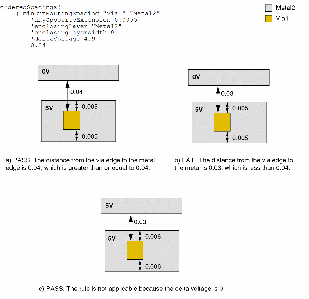 - Example 5: minCutRoutingSpacing with anyOppositeExtension and deltaVoltage