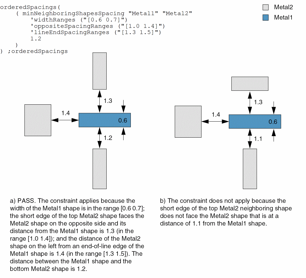 - Example 1: minNeighboringShapesSpacing with widthRanges, oppositeSpacingRanges, and lineEndSpacingRanges