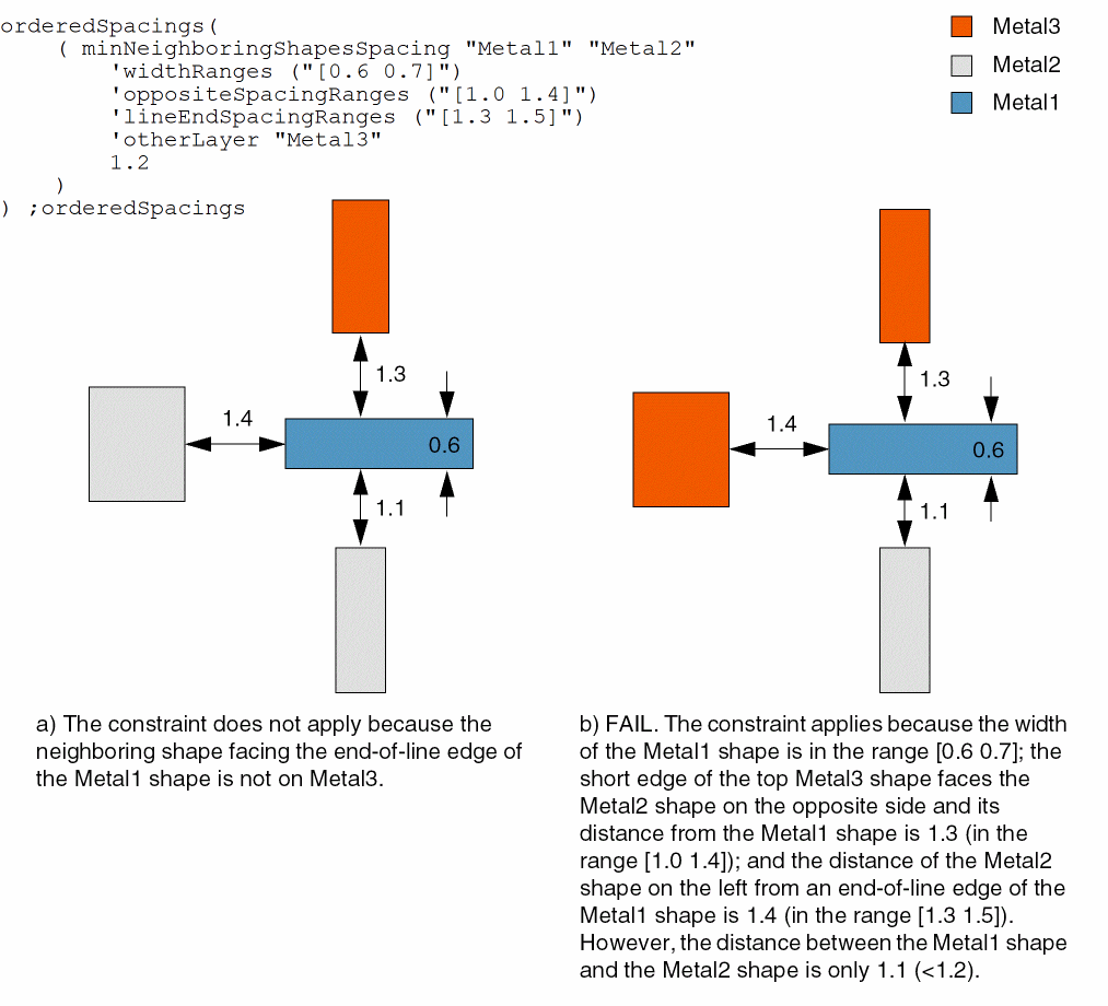 - Example 2: minNeighboringShapesSpacing with widthRanges, oppositeSpacingRanges, lineEndSpacingRanges, and otherLayer