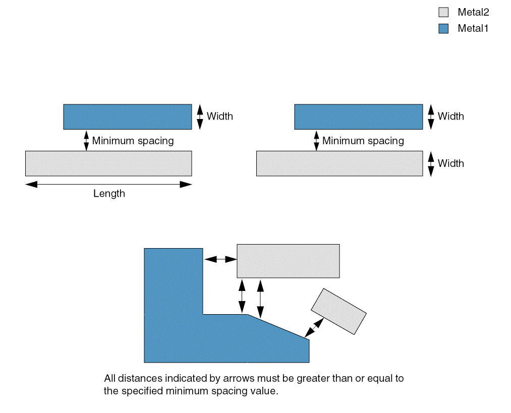 Specifies the minimum edge-to-edge spacing required between two adjacent, non-intersecting shapes on two different layers. The required spacing can be dependent on the direction in which the spacing is measured, on the width of both the shapes or on the width of the shapes and the parallel run length between them.