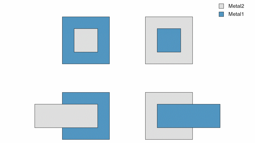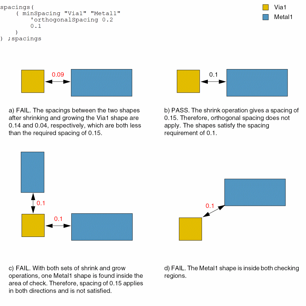 For some processes, the minimum spacing between a cut shape on one layer and a metal shape on a second layer on a different net is measured using a more complex method called orthogonal spacing. If the shapes are on the same net and orthogonal spacing is specified, the constraint does not apply.