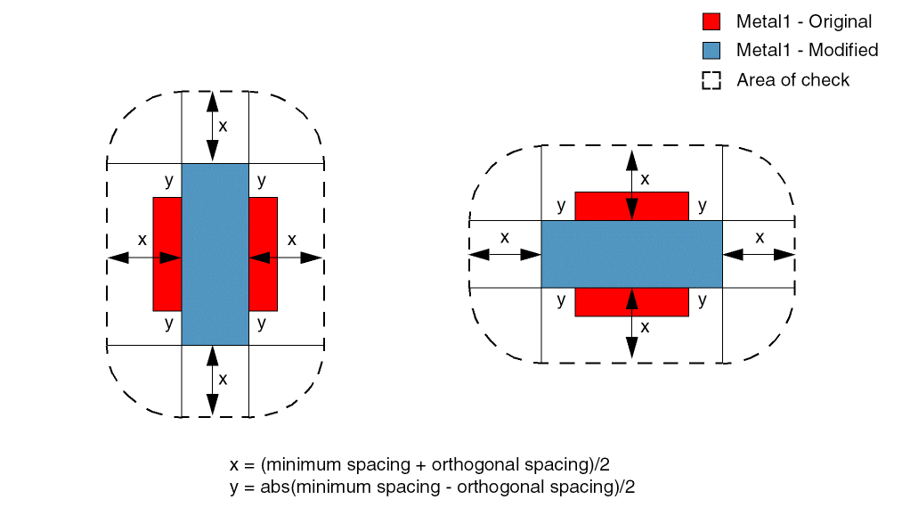 The minimum orthogonal spacing check is determined by the following method: A pair of opposite sides of the layer1 shape is grown by a distance equal to abs(minimum spacing - orthogonal spacing)/2, denoted by "y" in the figure below. Similarly, the other pair of opposite sides of the layer1 shape is shrunk by the same distance. The minimum required spacing between the modified layer1 shape and the layer2 shape is given by (minimum spacing + orthogonal spacing)/2, denoted by "x" in the figure below.