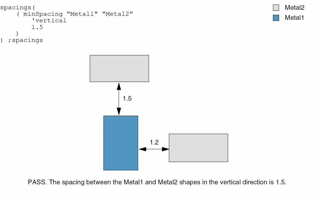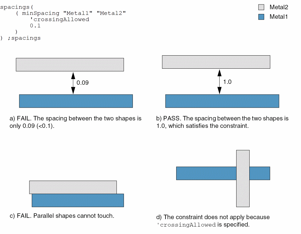 spacings( ( minSpacingtx_layer1tx_layer2['orthogonalSpacingf_orthoSpacing] ['horizontal | 'vertical] ['overlapNotAllowed] ['crossingAllowed] ['cornerAllowed] ['lengthf_length] ['exceptSameMetal] ['insideLayers (tx_layer4tx_layer5…tx_layerN) ['insidePurposes (t_purpose1t_purpose2…t_purposeN)] | 'outsideLayers (tx_layer4tx_layer5…tx_layerN) ['outsidePurposes (t_purpose1t_purpose2…t_purposeN)]f_spacing['manhattan] ['coincidentAllowed] )