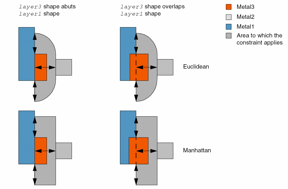 If both spacing and oppSpacing are specified, spacing describes the minimum spacing in the direction perpendicular to the layer1 edge abutted or overlapped by the layer3 shape and oppSpacing describes the minimum spacing parallel to this layer1 edge. The distance must be measured as Manhattan, as shown below.