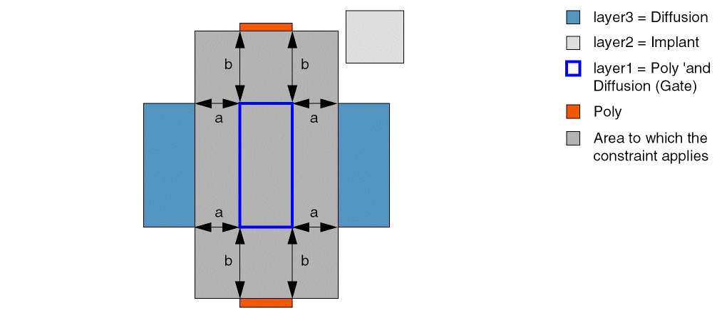 In this second example, in which layer3 is set to Diffusion, the spacing to the Implant layer must be at least a (spacing) in the direction of the touching Diffusion layer (that is, in the direction perpendicular to the layer1 edge overlapped by the layer3 shape) and b (oppSpacing) in the direction parallel to this layer1 edge.