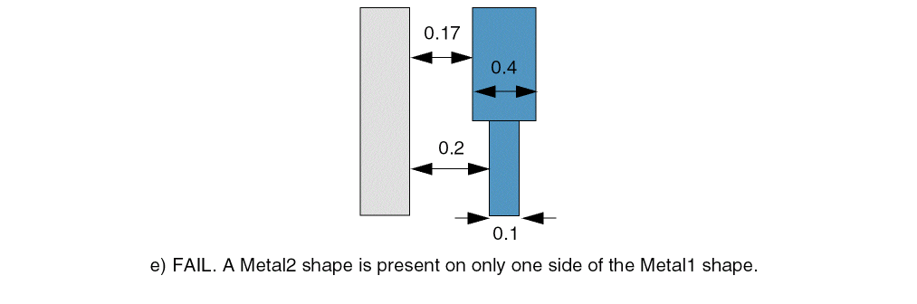 The horizontal spacing between a Metal1 shape and a Metal2 shape must be greater than or equal to 0.1 and less than or equal to 0.2 if Metal2 shapes are present along its full parallel run length on both sides, provided the width of the Metal1 shape is greater than or equal to 0.1 and less than or equal to 0.4.