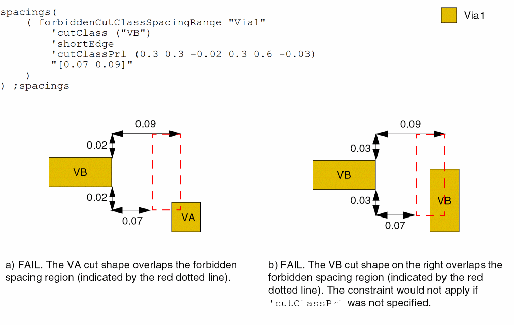 spacings( ( forbiddenCutClassSpacingRangetx_layer'cutClass {f_width| (f_widthf_length) |t_name} ['layertx_metalLayer['mask1 | 'mask2 | 'mask3] ['layerWidthf_layerWidth] 'paraLengthf_paraLength'withinf_within] ['sameMask] ['shortEdge | 'longEdge] ['vertical | 'horizontal] ['cutClassPrlg_cutClassPrl| 'allCuts]g_range)