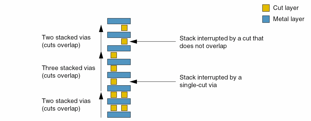 In the second example below, if the via stacking limit is set to 3 and 'noSingleCut is specified, the figure on the left violates the constraint because a single-cut via is not allowed in a stack that is taller than 3.