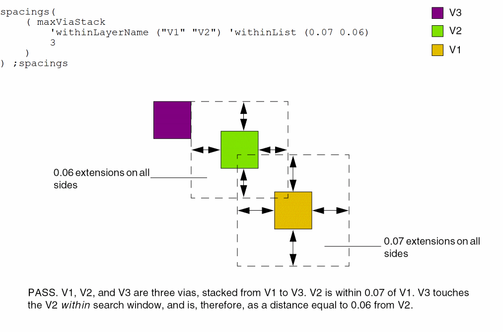 spacings( ( maxViaStack ['lowerLayertx_lowerLayer] ['upperLayertx_upperLayer] ['noSingleCut] ['oneSameMetalf_cutWithin] ['minMultiCutx_numCut] ['lowCutSizeWithin | 'withinLayerNamel_layerNames'withinListl_withinValues['centerToCenterListl_centerToCenterValues] | 'layertx_layerName'dualWithin (f_belowWithin f_aboveWithin) ] ['exceptIndividualAreaf_individualArea'exceptSumAreaf_sumArea|'exceptMaxAreal_metalLayerNamesAndAreas|'areaRatiol_areaRatio] ['exceptPGNet] |'exceptPGRouteTopologyListl_PGShapeTypeNames] ['exceptCutClassListl_cutClassNames] ['excludeEqualx_value] ['noViaListl_viaNames] ['noCutClassListl_cutClassNames] ['sameNetOnly] ['exceptExtensionLayerListl_layer'exceptExtensionMetalListl_metal'exceptExtensionValueListl_value'exceptExtensionDirectionListl_direction] ['insideLayers (tx_layer1tx_layer2…tx_layerN) ['insidePurposes (t_purpose1t_purpose2…t_purposeN)] |'outsideLayers (tx_layer1tx_layer2…tx_layerN) ['outsidePurposes (t_purpose1t_purpose2…t_purposeN)]]x_stackLimit)
