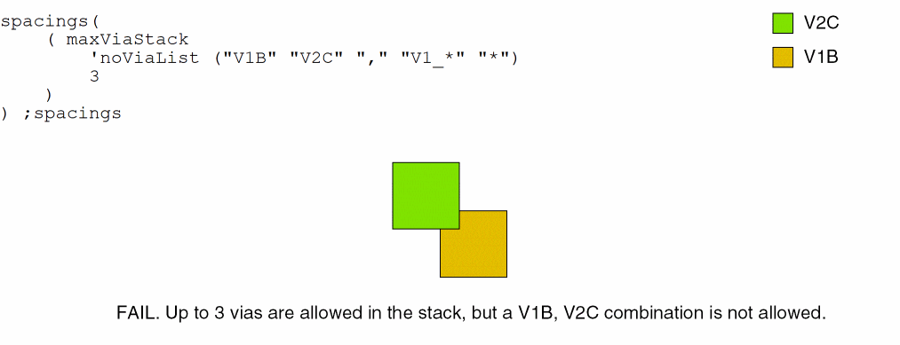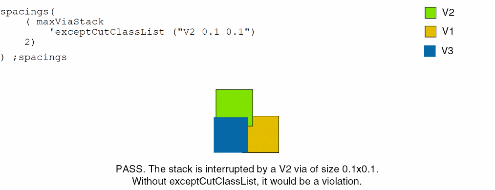 The noCutClassList parameter here specifies that via stacks containing a cut class of either size 0.06x0.12 or 0.06x0.06 on layer V12 and size 0.06x0.06 on layer V23 are a violation, even if the stack does not exceed the maximum height of 5.