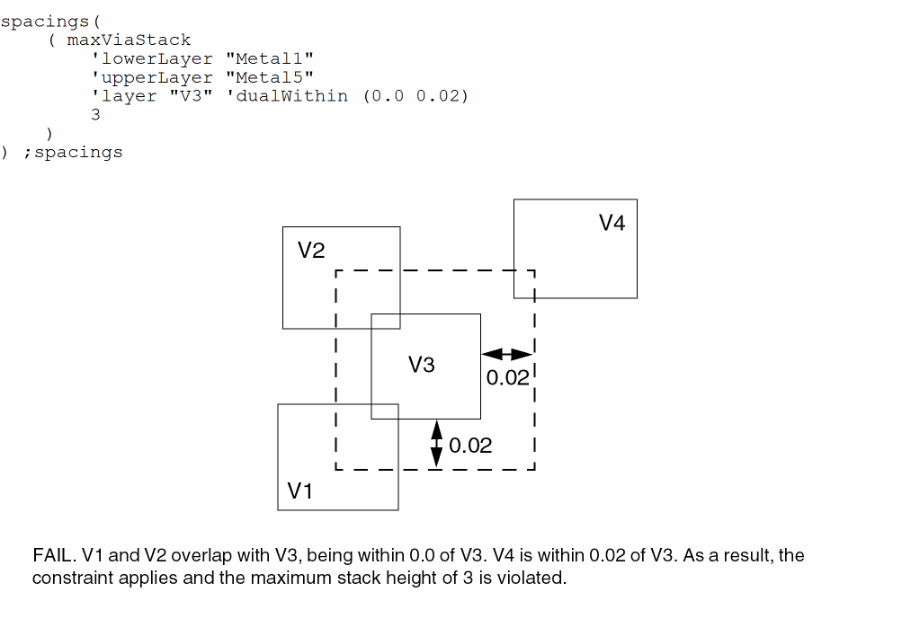 The constraint applies between Metal1 and Metal 5 only when all cuts are as specified by the dualWithin values, that is, when all via shapes below V3 are within 0.0 of the V3 shape and all via shapes above V3 are within 0.02 of the V3 shape.