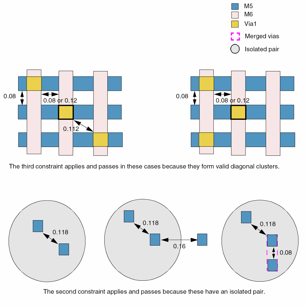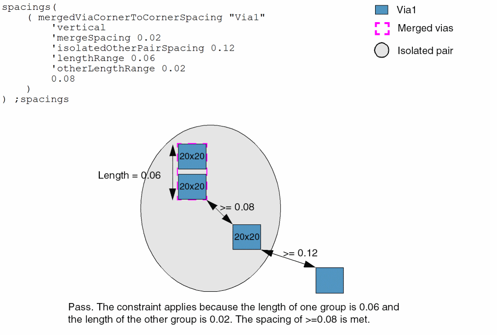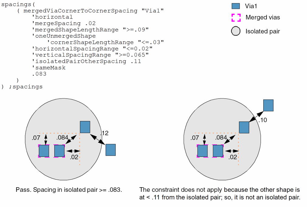 (Virtuoso Layout Suite EXL and higher tiers) Vias with cut edges satisfying viaEdgeType constraint are merged before checking corner-to-corner spacing.