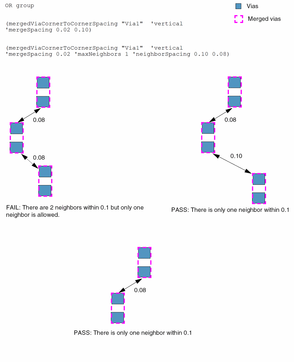 Consider the following example, which shows an OR group with three constraints. The first constraint is a regular corner-to-corner constraint. The second also includes isolatedOtherPairSpacing. The third further includes triplet via spacing parameters.