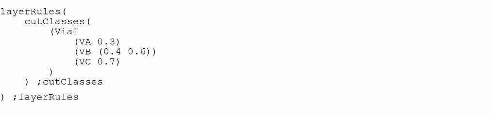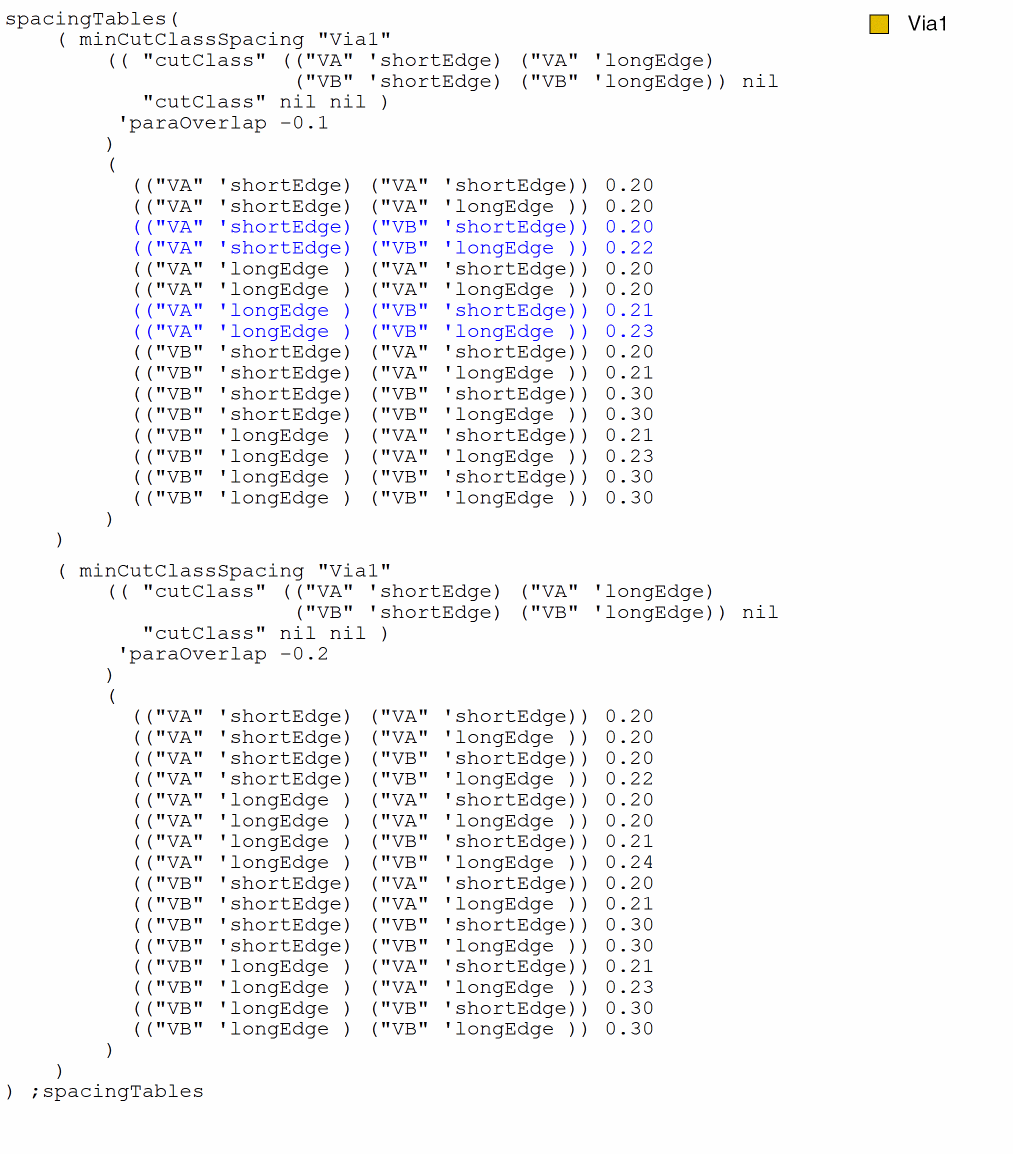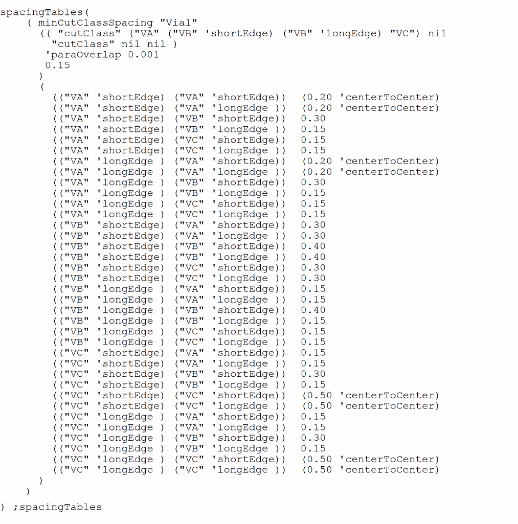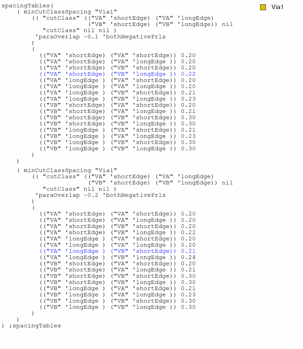 spacingTables( ( minCutClassSpacing "Via1" (( "cutClass" ("VA" ("VB" 'shortEdge) ("VB" 'longEdge) "VC") nil "cutClass" nil nil ) 'paraOverlap 0 'cutClassProfile (( "cutClass" (("VB" 'shortEdge) ("VB" 'longEdge)) nil