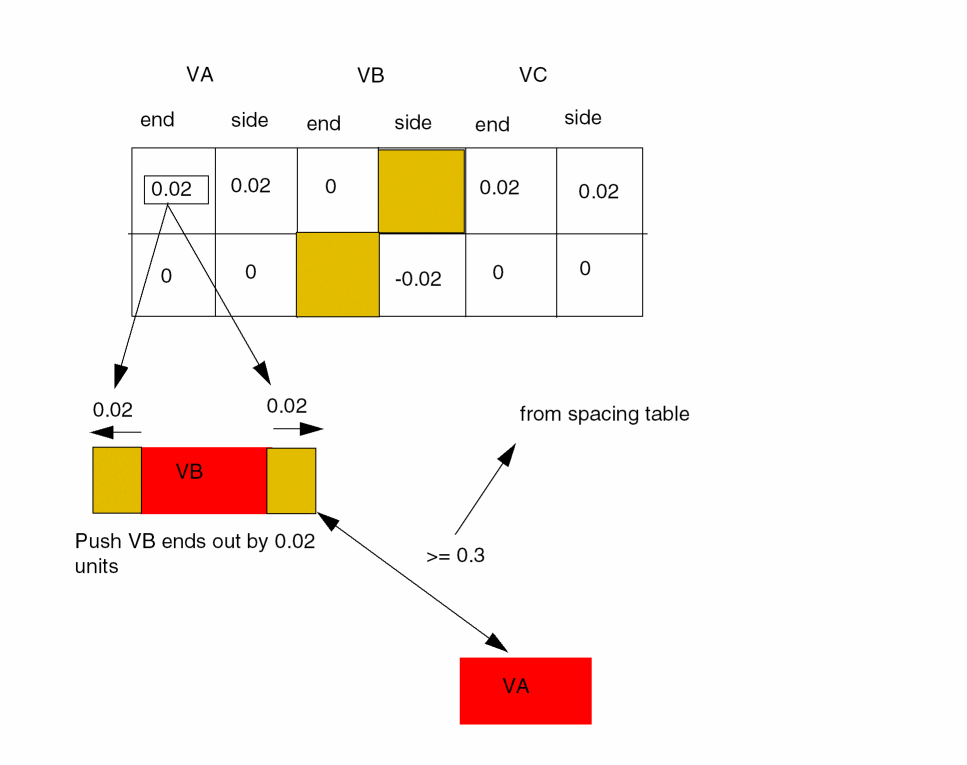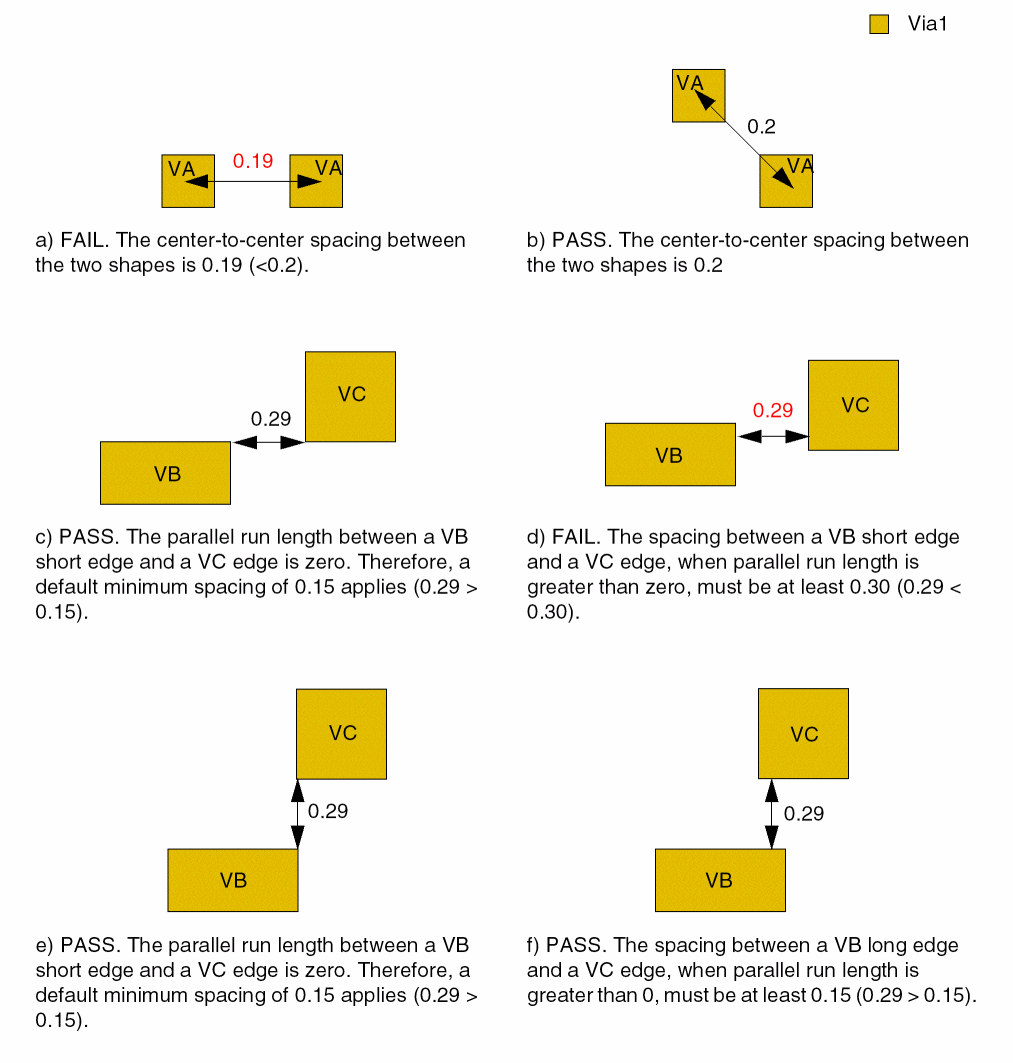 - Edge-to-edge spacing between the short edge of a VB via cut and a VA or VC via cut if parallel run length is greater than zero is 0.30.