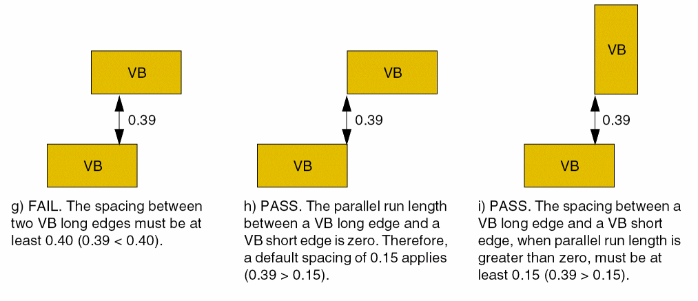 - Edge-to-edge spacing between the short edge of a VB via cut and an edge of another VB via cut if parallel run length is greater than zero is 0.40.