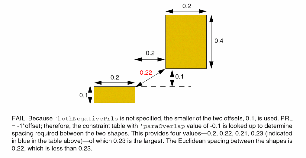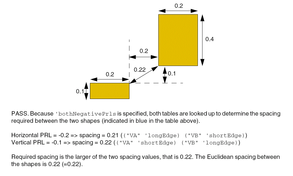 (Virtuoso Advanced Node for Layout Standard) If the parallel run length between the cut shapes is less than zero, this parameter allows both horizontal and vertical offsets between the cut shapes to be used as parallel run lengths. When this parameter is specified, two separate checks are performed using the two offset values. If horizontal offset is used as the parallel run length, required spacing is looked up by taking into account the vertical edges facing each other, and when vertical offset is used as the parallel run length, required spacing is looked up by taking into account the horizontal edges facing each other. The maximum of the spacing values thus obtained is the required spacing. If this parameter is not specified, the smaller of the two offsets is considered as the parallel run length and spacing is looked up using this value. Because the edges that are facing each other cannot be determined, the maximum of the four possible spacing values is compared with the Euclidean spacing. |