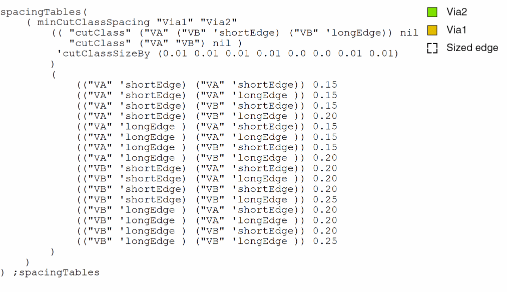 spacingTables( ( minCutClassSpacing "Via1" "Via2" (( "cutClass" ("VD" ("VE" 'longEdge) ("VE" 'shortEdge) "VF") nil