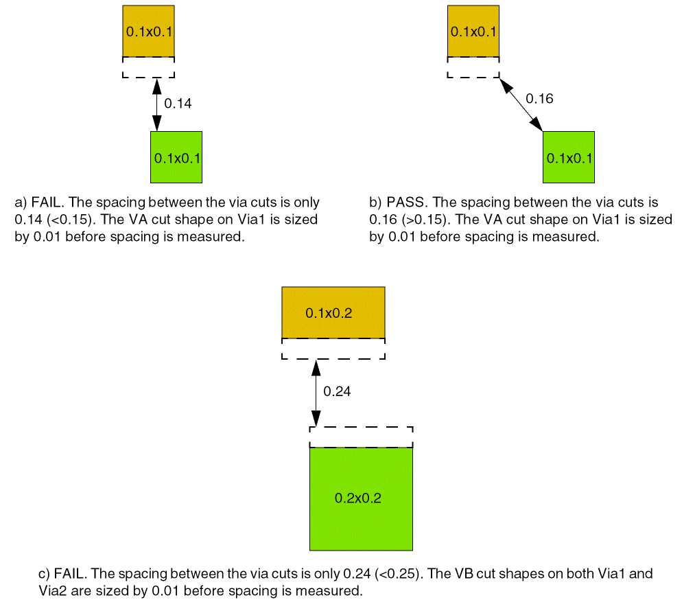 The spacing between cut shapes on layers Via1 and Via2 is defined as follows: