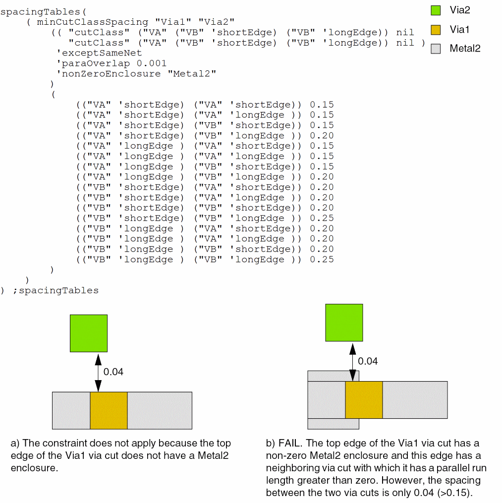 spacingTables( ( minCutClassSpacingtx_cutLayer1 tx_cutLayer2(( "cutClass" (g_index…) nil "cutClass" (g_index…) nil) [['sameNet | 'sameMetal] | ['exceptSameNet]] ['spacingPrl (f_prlf_spacing)] ['centerToCenter] ['paraOverlapf_overlap] ['nonCutClassEdgeSpacing (f_length1 f_space1 f_length2 f_space2…)] ['cutClassProfile (( "cutClass" (g_index…) nil "cutClass" (g_index…) nil ) (g_cutClassProfileTable) ) ] ['nonZeroEnclosuretx_layer['minEnclosuref_minEnclosure] ] ['cutClassSizeBy ({f_size1 f_size2} …)] [f_default] ) (g_table) ['manhattan] )