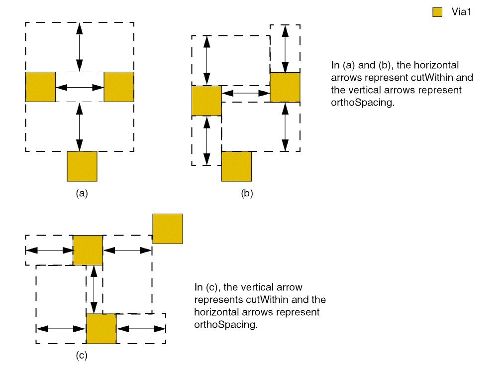 The following figure illustrates how orthogonal spacing is applied. If the distance between the overlapping via cuts is less than cutWithin, the spacing between the overlapping via cut pair and any other via cut must be greater than orthoSpacing.