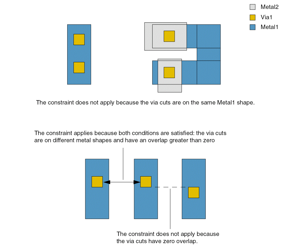 Specifies the minimum spacing between via cuts on a layer if the via cuts have parallel edges with an overlap greater than zero. The constraint does not apply if the via cuts share the same metal shape.