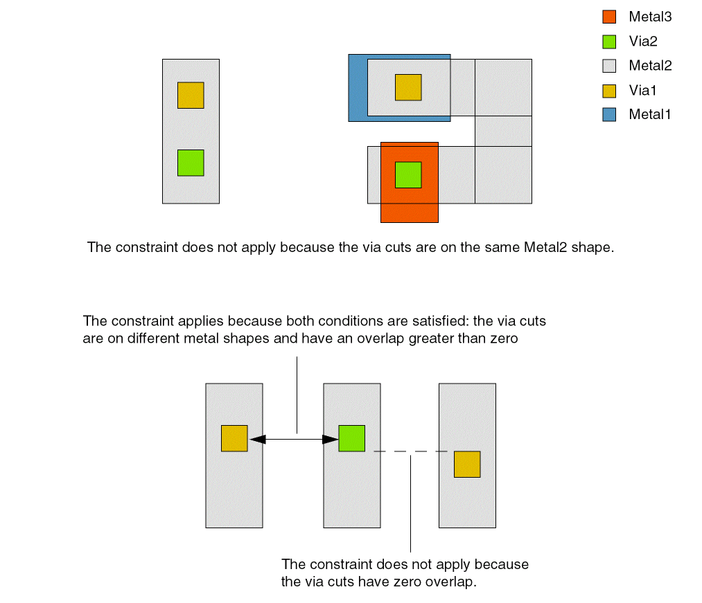 Specifies the minimum edge-to-edge spacing between via cuts on two different layers if the via cuts have parallel edges with an overlap greater than zero. The constraint does not apply if the via cuts share the same metal shape on the layer between the cut layers.
