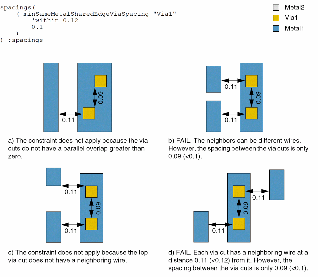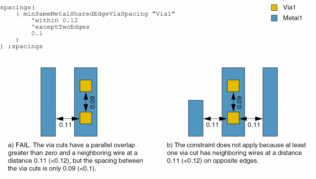- Example 1: minSameMetalSharedEdgeViaSpacing with within and exceptTwoEdges
